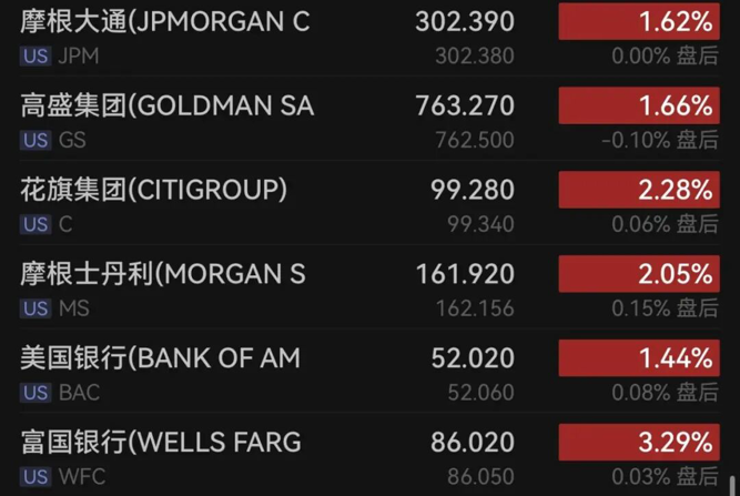 银行股全线上涨,摩根大通涨超1%,高盛涨逾1%,花旗涨超2%,摩根士丹利涨逾2%,美国银行涨超1%,富国银行涨逾3%。