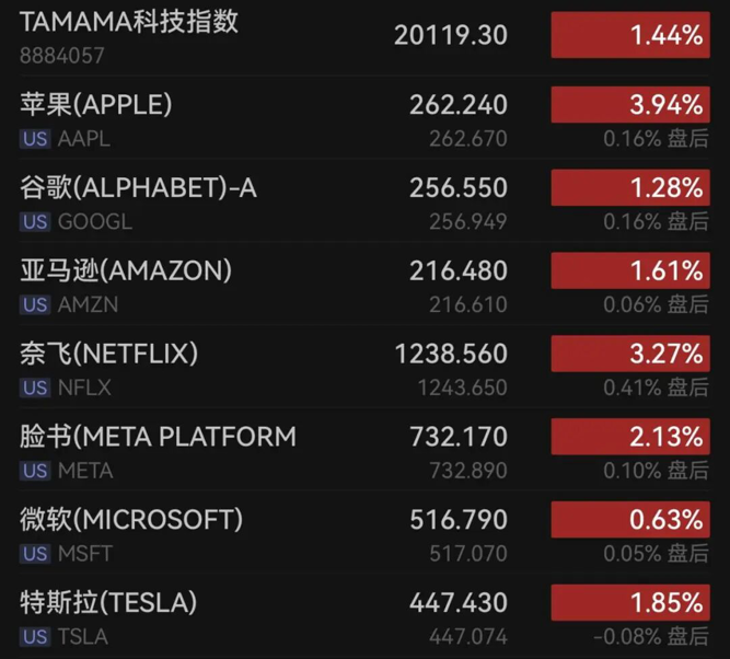 大型科技股多数上涨,万得美国科技七巨头指数上涨1.44%,苹果涨近4%,脸书涨超2%,特斯拉涨逾1%,亚马逊涨超1%,谷歌涨逾1%,微软涨0.63%。