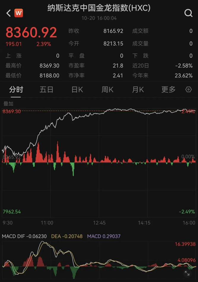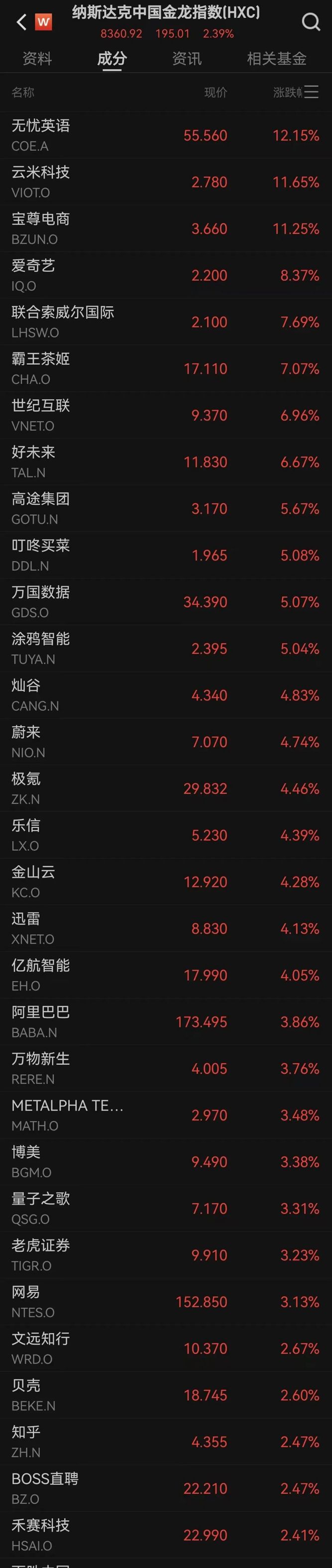 中概股普遍上涨,纳斯达克中国金龙指数涨2.39%,万得中概科技龙头指数涨2.31%。个股方面,爱奇艺涨超8%,世纪互联涨约7%,好未来涨超6%,万国数据涨约5%,涂鸦智能涨逾5%,蔚来涨超4%,阿里巴巴涨近4%。