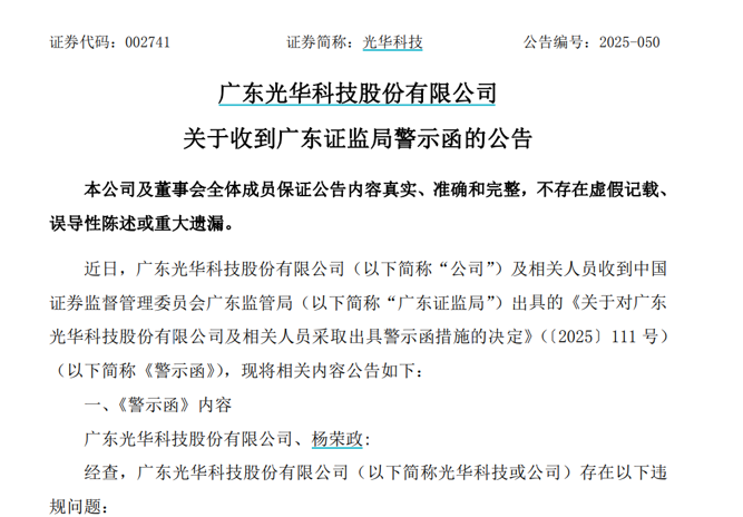 广东证监局表示,上述行为《违反了上市公司信息披露管理办法》的规定。光华科技董事会秘书杨荣政未履行勤勉尽责义务,对公司上述违规行为负有主要责任。最终,广东证监局决定对光华科技及杨荣政采取出具警示函的行政监管措施。