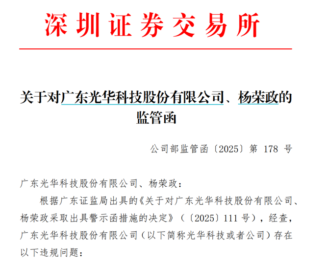 同期,深交所就相同事由对光华科技及杨荣政下发监管函,要求光华科技及全体董事、高级管理人员认真吸取教训,真实、准确、完整、及时、公平地履行信息披露义务,杜绝此类事件发生。
