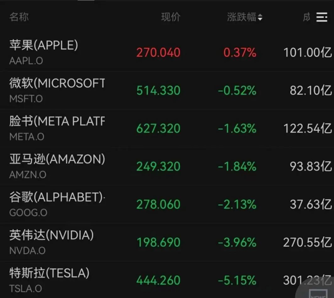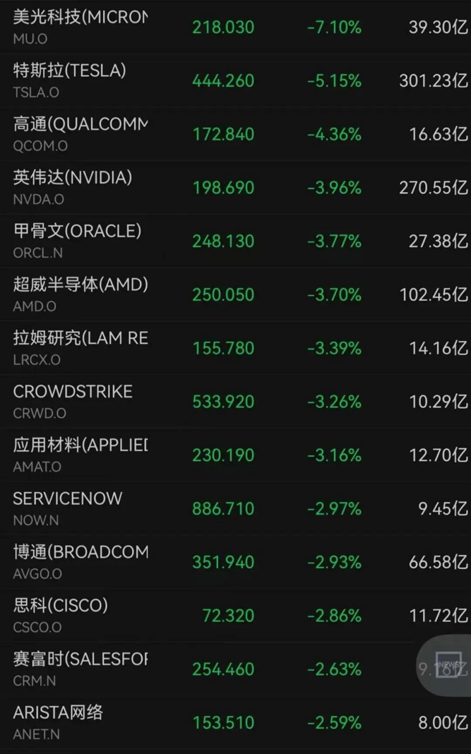 美光科技下跌7.10%,高通下跌4.36%,甲骨文下跌3.77%,特斯拉下跌5.15%,英伟达下跌3.96%,谷歌下跌2.13%。