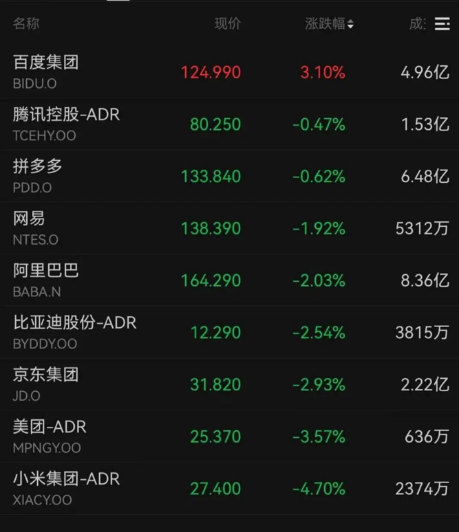 小米下跌4.70%,美团下跌3.57%,京东下跌2.93%,阿里巴巴下跌2.03%,霸王茶姬下跌2.23%,新东方下跌2.10%。
