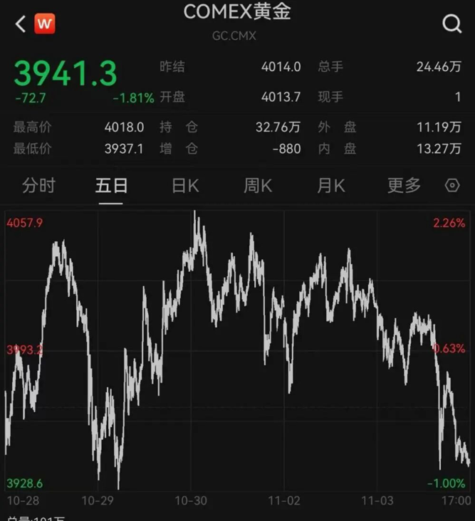 美股交易时段,黄金也被抛售,COMEX黄金指数大幅走低。