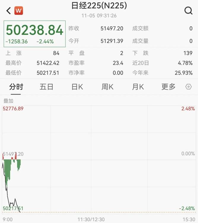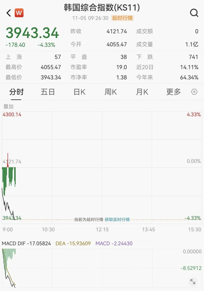11月5日,韩国综合指数跌破4000点关口,跌幅扩大至4%。