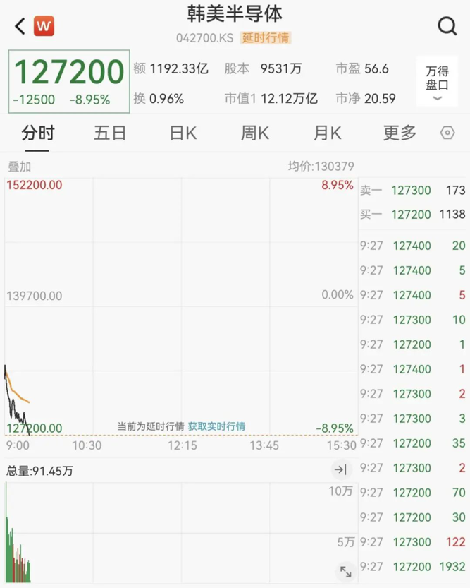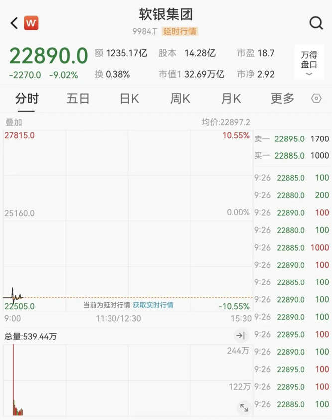 日本芯片相关股票大幅下跌,此前美国科技股遭抛售。软银集团股价一度跌超10%,爱德万测试下跌6.5%。