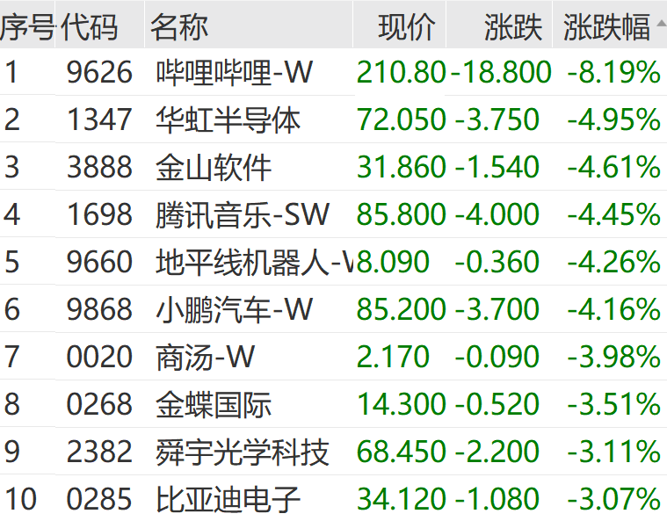 港股三大指数早间集体低开,恒生指数跌近1%,恒生科技指数跌1.75%。上午港股同步震荡,截至发稿,三大指数均跌超1%。哔哩哔哩大跌8%,领跌恒生科技指数成份股。