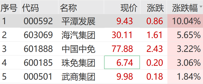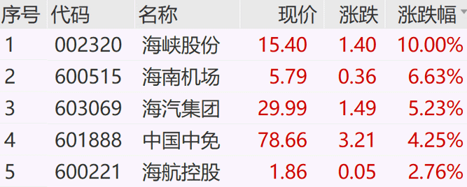 个股方面,海峡股份、东百集团、平潭发展等涨停,海南机场、凯撒旅业、天府文旅等多股大涨。