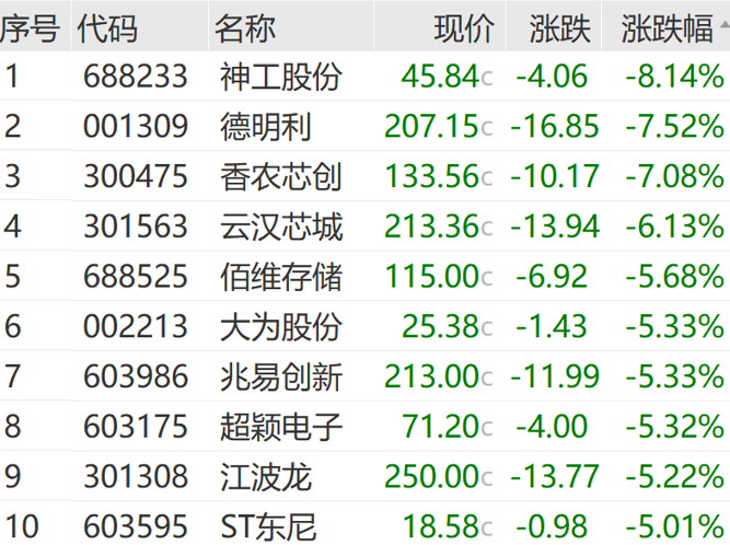11月5日,A股存储芯片板块开盘走低,神工股份跌超8%,德明利、香农芯创跌超7%,佰维存储、大为股份、兆易创新纷纷低开。