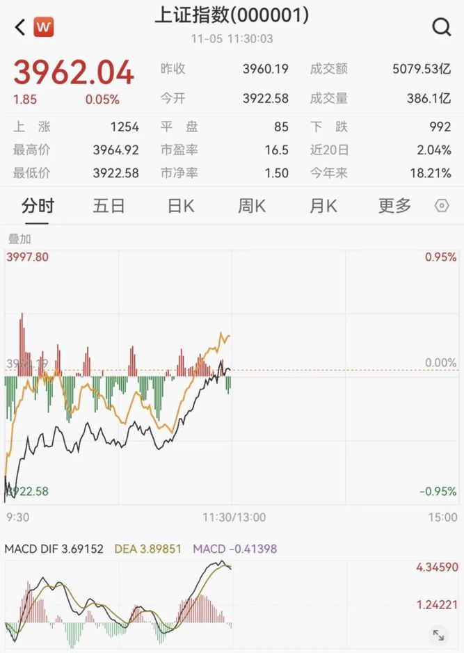 11月5日早盘,A股市场低开高走,沪指、创业板指双双拉升翻红。截至午间收盘,截至收盘,沪指涨0.05%,深成指跌0.15%,创业板指涨0.17%。