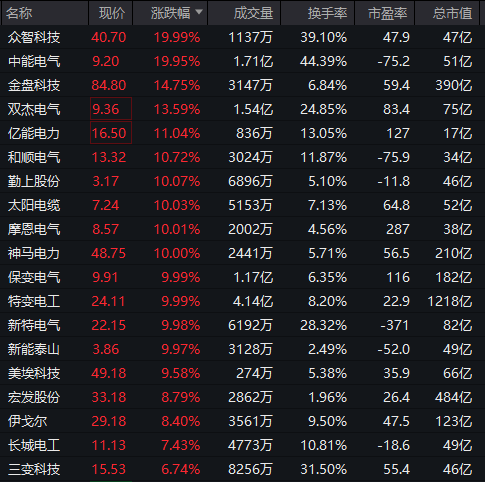 电工电网概念股持续拉升,众智科技、中能电气20%涨停,勤上股份、太阳电缆、神马电力、特变电工等多股涨停。