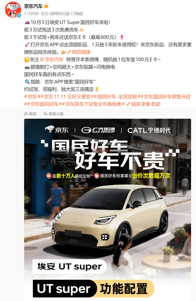 此前,京东于10月14日官宣,2025京东“11·11”期间,京东联合广汽、宁德时代将正式推出一款神秘“国民好车”。根据规划,该车将在京东独家销售。