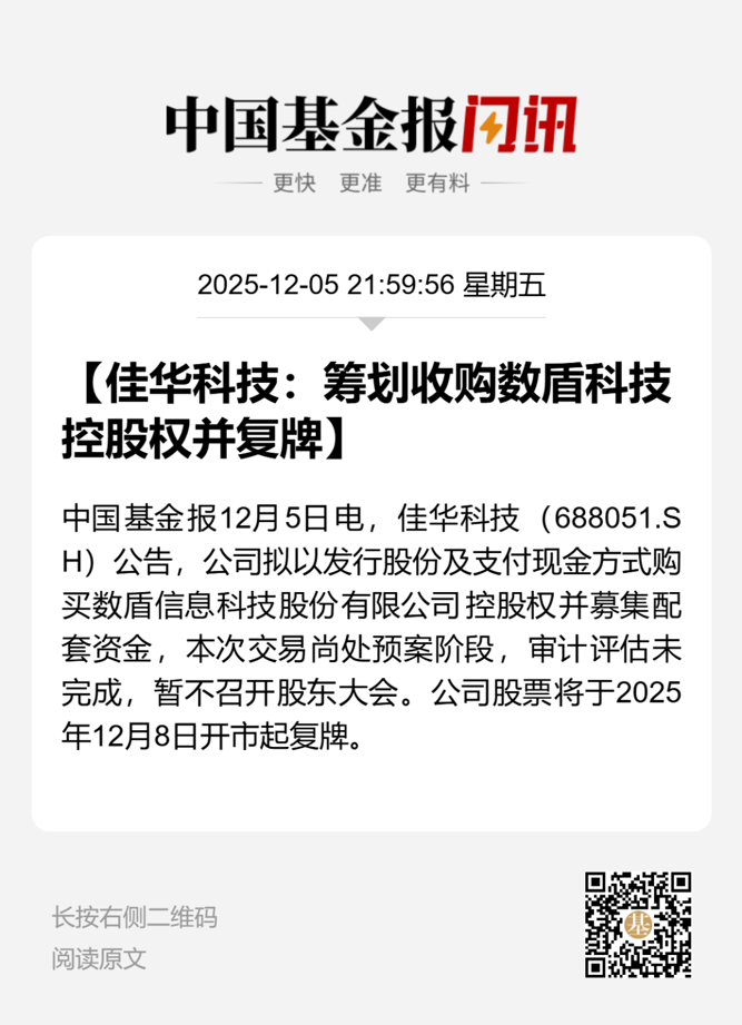 【导读】佳华科技拟收购数盾科技控股权,自12月8日开市起复牌