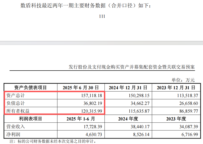 截至2025年6月30日,数盾科技的总资产为15.71亿元,所有者权益为12.03亿元。