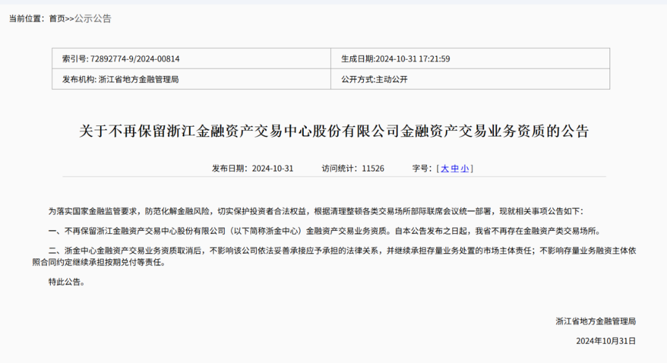 而在2024年10月底,浙金中心的金融资产交易业务资质被取消。