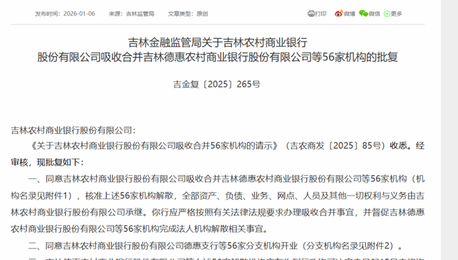 1月6日,吉林金融监管局批复公告称,同意吉林农村商业银行股份有限公司(以下简称吉林农商银行)吸收省内8家农商银行及48家村镇银行,核准上述56家机构解散。