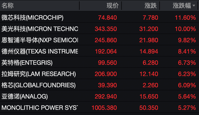 费城半导体指数上涨2.75%。微芯科技、美光科技、恩智浦半导体等均大幅收涨。