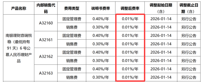 1月7日,南银理财发布公告,调整持有期为91天和189天的悦稳系列产品的固定管理费和销售费。