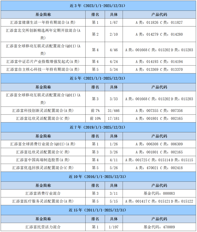 排名数据来自银河证券基金研究中心发布的中国公募基金长期业绩榜单,基金类别按照银河证券三级分类,截至2025/12/31。汇添富香港优势精选混合(QDII)(A类)、汇添富全球移动互联灵活配置混合(QDII)(A类)、汇添富全球消费行业混合(QDII)(A类)属于QDII混合基金(A类);汇添富自主核心科技一年持有期混合(A类)属于TMT与信息技术行业偏股型基金(A类);汇添富北交所创新精选两年定期开放混合(A类)属于北交所主题偏股型基金(A类);汇添富ESG可持续成长股票(A类)、汇添富中国高端制造股票(A类)属于标准股票型基金(A类);汇添富优选回报灵活配置混合(C类)、汇添富达欣灵活配置混合(C类)属于灵活配置型基金(基准股票比例30%-60%)(非A类);汇添富科技创新灵活配置混合(A类)、汇添富策略增长灵活配置混合属于灵活配置型基金(基准股票比例60%-100%)(A类);汇添富品牌力一年持有期混合(A类)、汇添富优势企业精选混合(A类)、汇添富数字未来混合(A类)、汇添富民营活力混合属于偏股型基金(股票上下限60%-95%)(A类);汇添富数字经济核心产业一年持有期混合(D类)属于偏股型基金(股票上下限60%-95%)(非A类);汇添富消费行业混合属于消费行业偏股型基金(A类);汇添富健康生活一年持有期混合(A类)、汇添富医疗服务灵活配置混合(A类)属于医药医疗健康行业偏股型基金(A类);汇添富中证科创创业50指数增强发起式(A类)、汇添富国证2000指数增强(A类)、汇添富中证芯片产业指数增强发起式(A类)属于增强规模指数股票型基金(A类)。