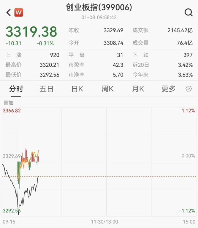 1月8日开盘,A股市场指数震荡调整,创业板指一度跌逾1%,随后震荡拉升,跌幅收窄。