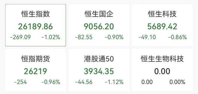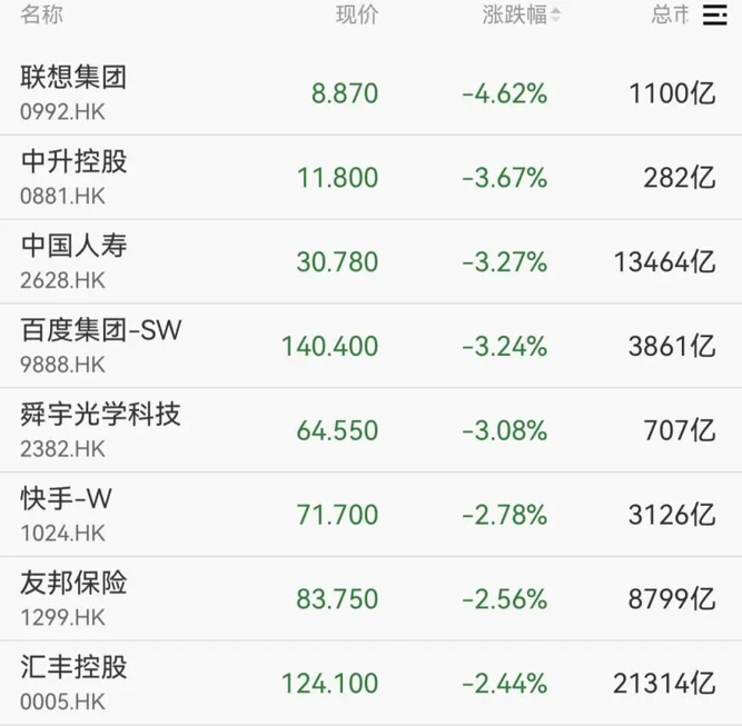 港股方面,恒指跌超1%,联想集团、中国人寿、百度集团等跌幅居前。