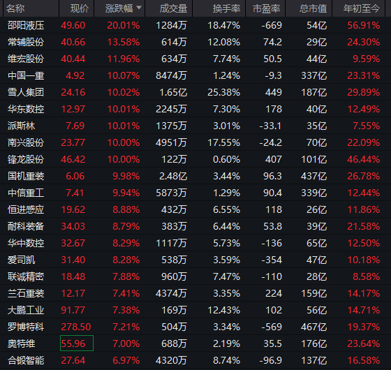 工业机械板块低开高走,邵阳液压20%涨停,派斯林、华东数控、南兴股份等多股涨停。