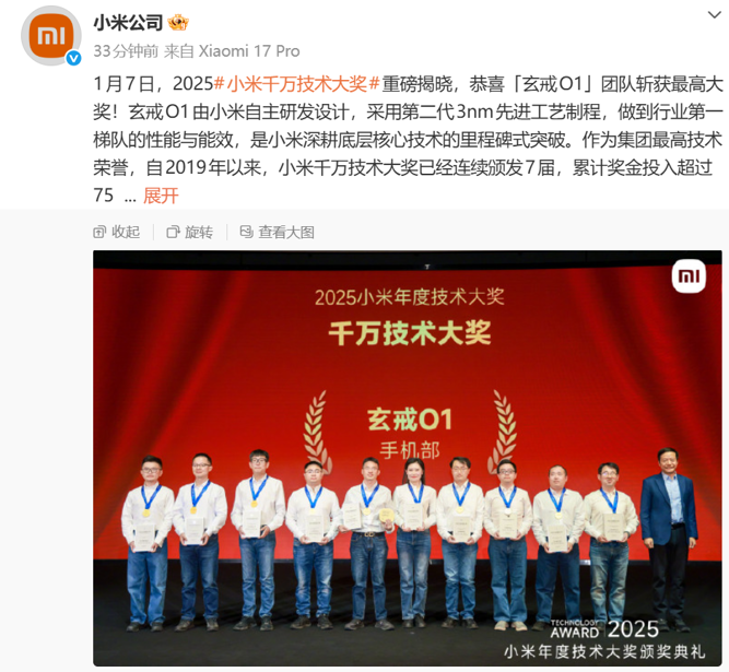 1月8日上午,小米公司亦发布微博称,恭喜玄戒O1团队斩获最高大奖。玄戒O1由小米自主研发设计,采用第二代3nm先进工艺制程,做到行业第一梯队的性能与能效,是小米深耕底层核心技术的里程碑式突破。