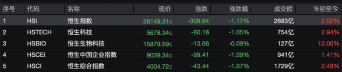 1月8日,港股三大指数齐跌。截至收盘,恒生指数跌1.17%,恒生科技指数跌1.05%,恒生国企指数跌1.09%。全日大市成交额为2683亿港元,南向资金净卖出49.01亿港元。