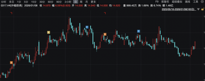 1月8日,中船防务涨6.59%。
