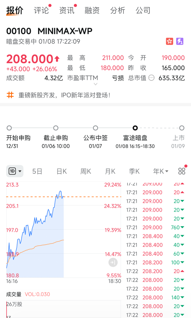 另一AI大模型公司MINIMAX将于1月9日登陆港交所。截至记者发稿,MINIMAX-WP于富途暗盘交易场中报208.00港元/股,较招股价上涨26.06%。按此价格估算,每手20股账面浮盈约858港元。