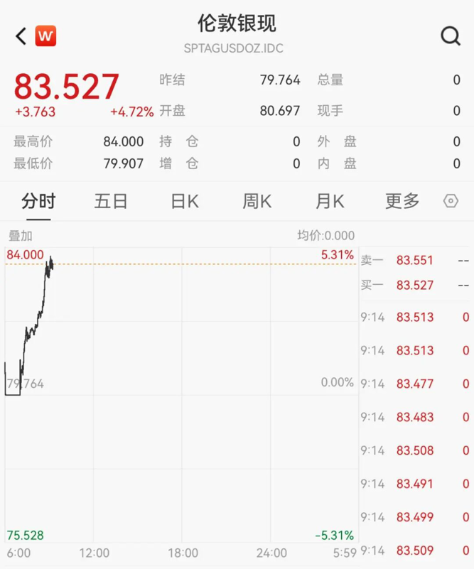 现货白银涨幅扩大至4%,最高价报84美元/盎司,创历史新高。截至发稿报83.527美元/盎司。