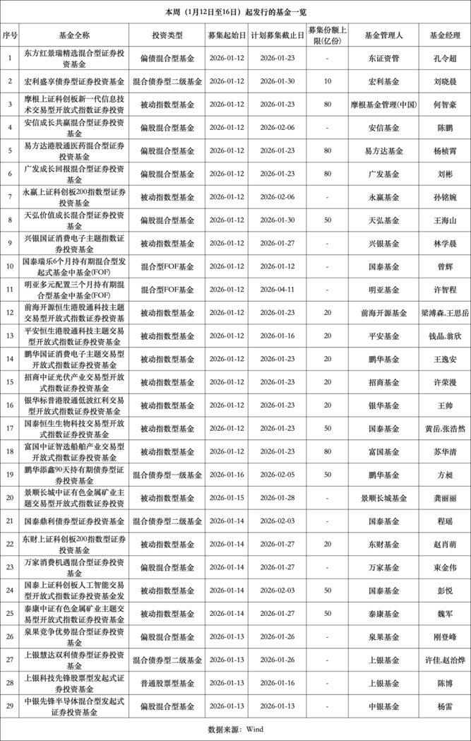 本周(1月12日—1月16日),全市场共29只新基金面向投资者公开发行。