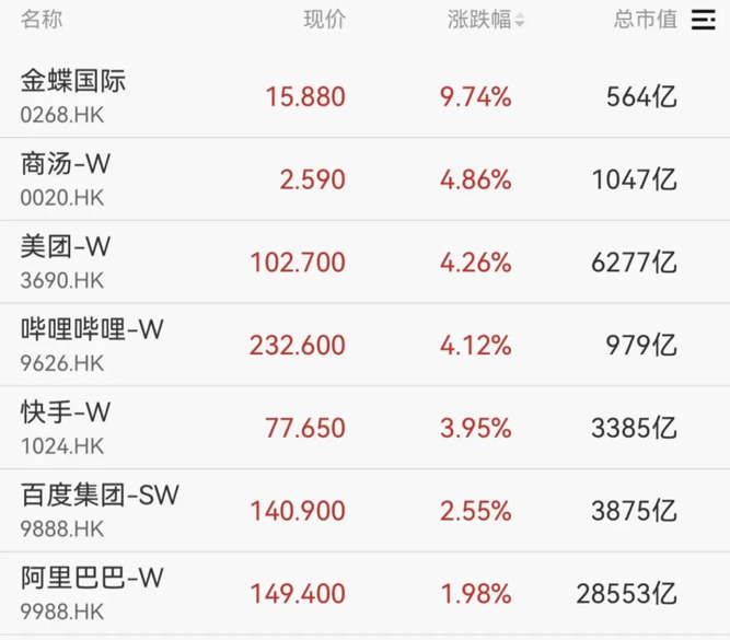 港股方面,三大指数走高,金蝶国际、商汤、美团等涨幅居前。