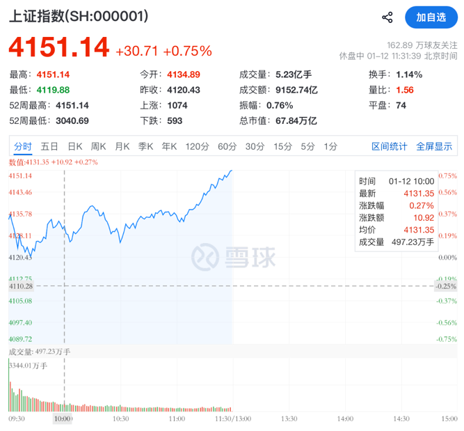 1月12日上午,A股三大股指集体上涨,沪指强势站上4150点,沪深两市半日成交额超2.3万亿元,已连续第10个交易日突破2万亿元。