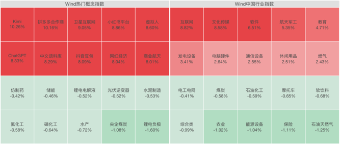 从板块看,文化传媒、软件开发、商业航天等板块涨幅居前,Sora概念股强势走高,光伏设备、医疗服务板块拉升;保险、石油天然气等板块下挫。