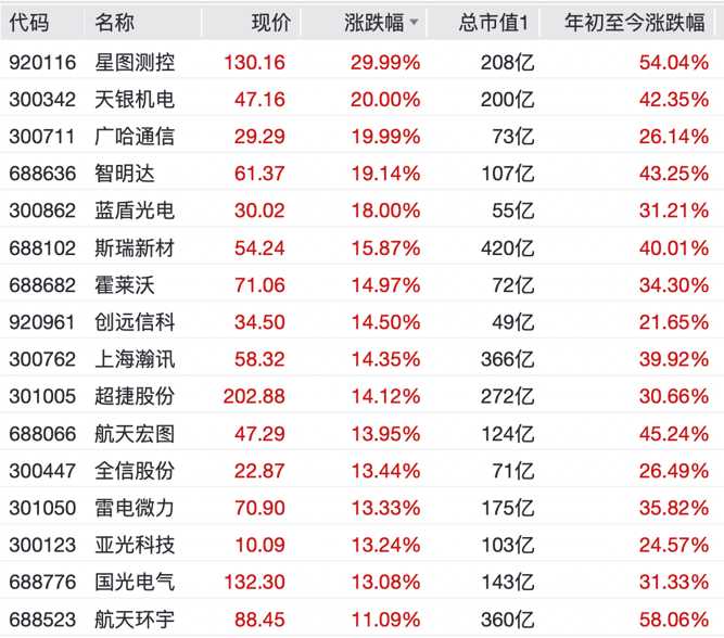 个股方面,中国卫星、航天电子录得10cm涨停,星图测控录得30cm涨停,天银机电、广哈通信录得20cm涨停,中国卫通涨9.68%,斯瑞新材、上海瀚讯、航天环宇等涨幅均超10%。