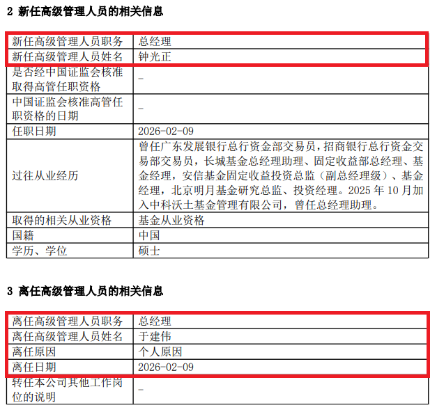 2月10日,中科沃土基金公告,总经理于建伟因个人原因离职,任命钟光正担任公司新一任总经理。