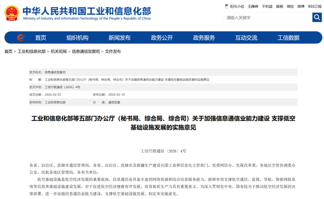 2月10日,工业和信息化部办公厅、中央网络安全和信息化委员会办公室秘书局、中央空中交通管理委员会办公室综合局、国家发展和改革委员会办公厅、中国民用航空局综合司发布《关于加强信息通信业能力建设 支撑低空基础设施发展的实施意见》(以下简称《实施意见》)。