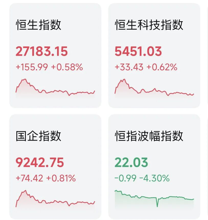 2月10日,港股三大指数震荡,集体冲高回落。截至收盘,恒生指数涨0.58%,报27183.15点;恒生国企指数涨0.81%,报9242.75点;恒生科技指数涨0.62%,报5451.03点。