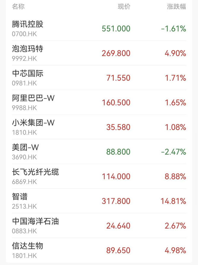 盘面上,大型科技股多数收涨,京东、小米、阿里巴巴涨超1%;生物技术股普遍上扬,复宏汉霖涨超7%,荣昌生物涨超6%,药明生物、药明康德涨超4%;汽车股普涨,比亚迪股份涨超2%,零跑汽车、理想汽车涨超1%,蔚来、小鹏汽车涨近1%;AI应用股多数走高,智谱一度涨超21%,阅文集团涨超15%,阜博集团涨超13%。