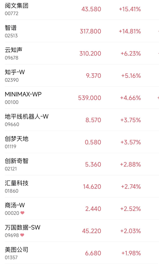 【导读】港股三大指数集体收涨!AI应用股大爆发,“全球大模型第一股”一度大涨超21%