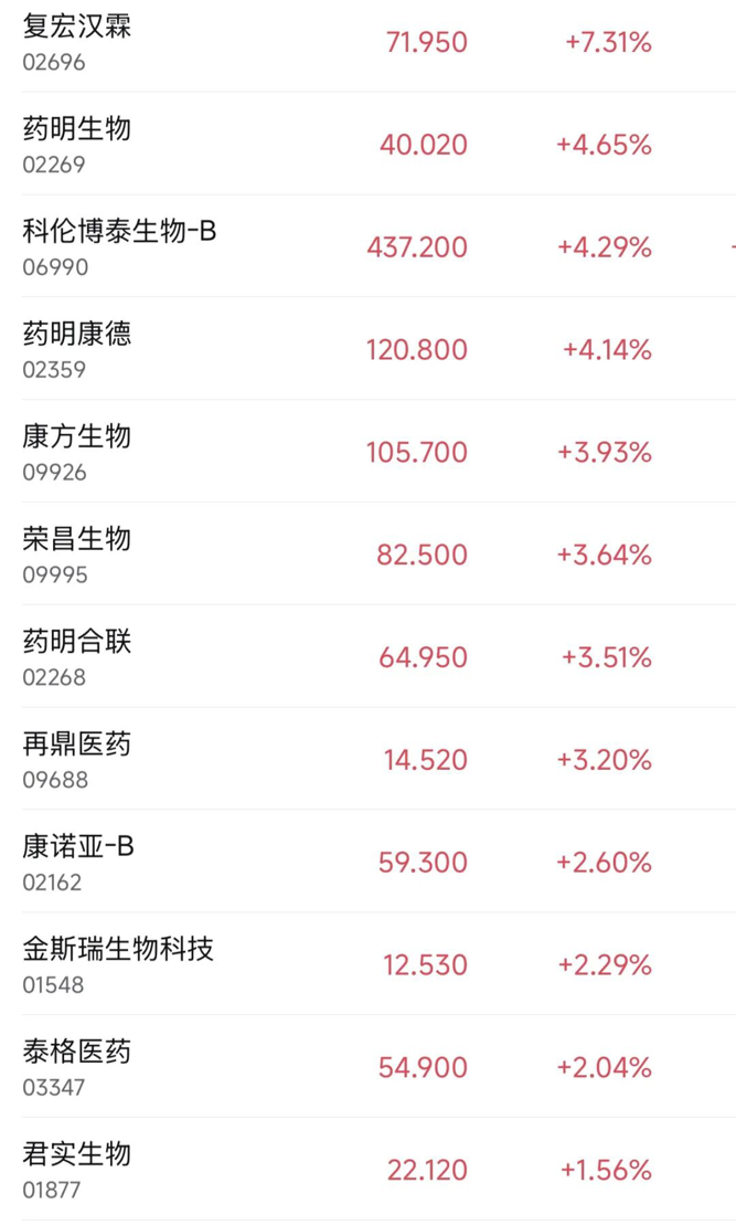2月10日,港股生物医药板块也上涨,复宏汉霖涨超7%,药明生物、药明康德、康方生物、荣昌生物等多股跟涨。