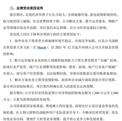 英飞拓1月4日晚间发布业绩预告,预计2022年归母净利亏损6亿元-8亿元,上年同期亏损14.35亿元。报告期内,宏观经济形势下行压力较大,全球地缘环境、新冠疫情影响持续,地方政府投入减缓,社会消费持续下降,公司解决方案、数字运营服务、物联产品等领域市场竞争加剧,项目签约未达预期,对公司经营造成较大影响。