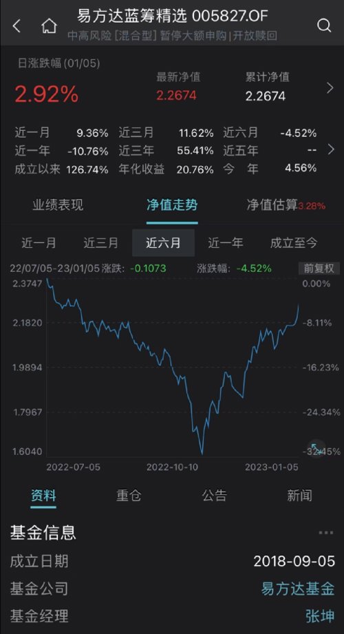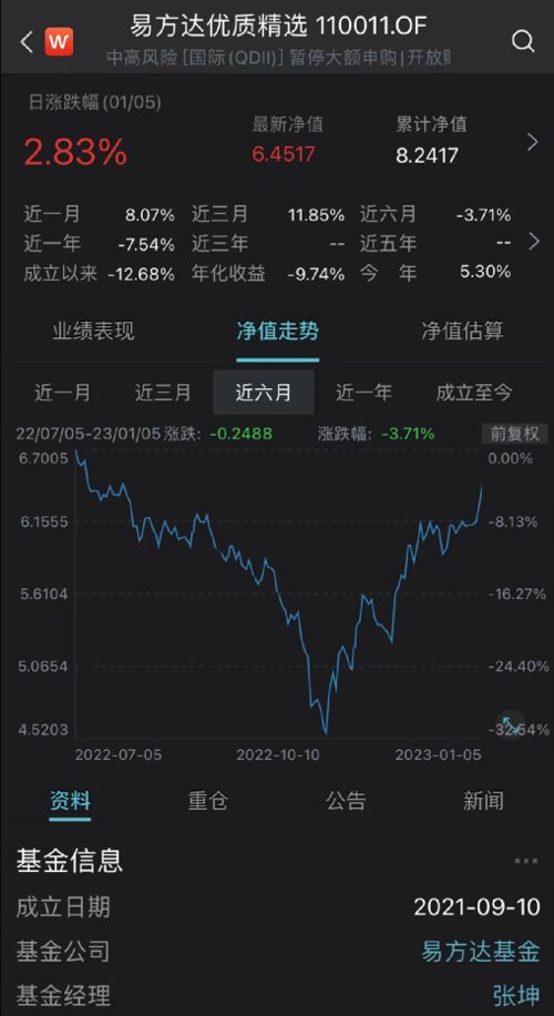 数据显示,截至2023年1月5日,自去年11月1日以来,张坤管理的易方达优质精选净值增长率高达42.73%。他所管理的其他基金净值也快速回血。
