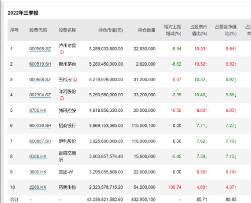 从张坤管理规模最大的易方达蓝筹精选来看,数据显示,该基金去年三季度末保持高仓位运作,仓位在94.02%,其中港股持有比例达到35.55%。前十大重仓股持有主要是泸州老窖、贵州茅台、五粮液、洋河股份等白酒股,此外,还持有腾讯控股、香港交易所、美团-W、药明生物等港股。