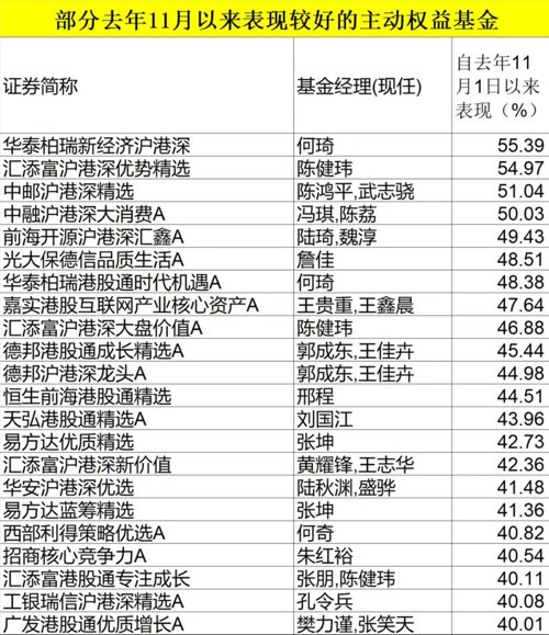 不仅张坤管理基金表现出色,自去年11月以来一大批主动权益基金反弹超40%,多为沪港深基金,甚至有观点认为“含港率”成为近期基金业绩涨幅的胜负手。