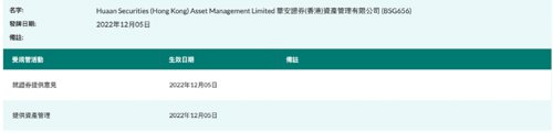 来自香港证监会的数据显示,2022年12月华安证券香港子公司Huaan Securities(Hong Kong) Asset Management Limited (华安证券(香港)资产管理有限公司)获批香港证监会4号、9号牌。