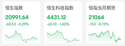 恒生指数早盘震荡,午后遇阻反复,收跌60点,跌幅0.29%;恒生科技指数跌幅1.40%。