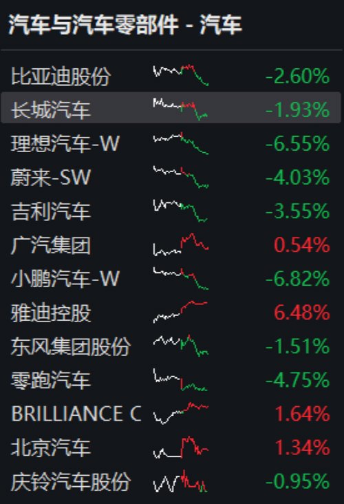受降价带来的竞争压力影响,新势力“蔚小理”均出现了不同程度的下跌,整个港股汽车板块大面积走绿,新能源车龙头比亚迪股份也小幅下跌。