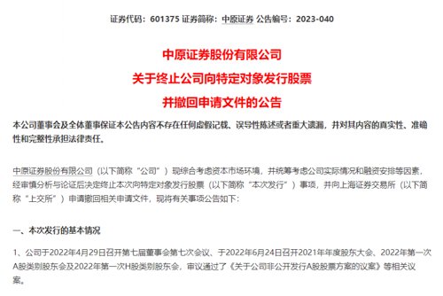 7月21日晚间,中原证券表示,综合考虑资本市场环境,并统筹考虑公司实际情况和融资安排等因素,经审慎分析与论证后决定终止本次向特定对象发行股票事项(定向增发),并向上交所申请撤回相关申请文件。